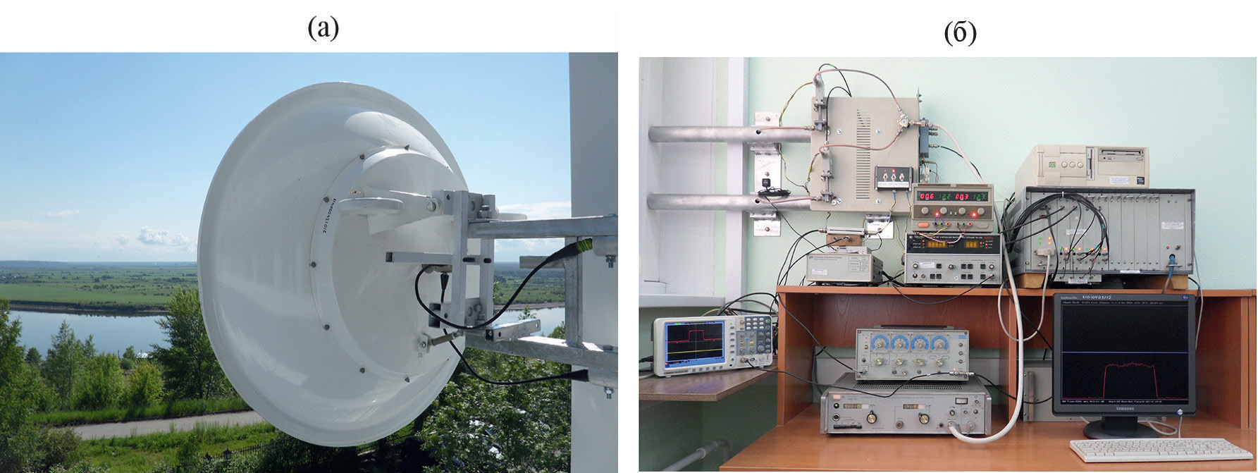 Рис. 4. Внешний вид приемного устройства экспериментальной установки: а – зеркальная антенна с ЛПР, б – двухканальное приемное устройство ортогонально-поляризованных сигналов.