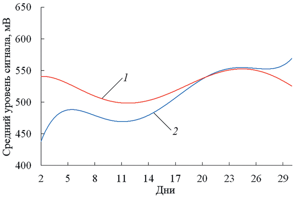 Рис. 8. Средний уровень принятых сигналов за весь период измерений: 1 – с горизонтальной поляризацией, 2 – с вертикальной поляризацией.