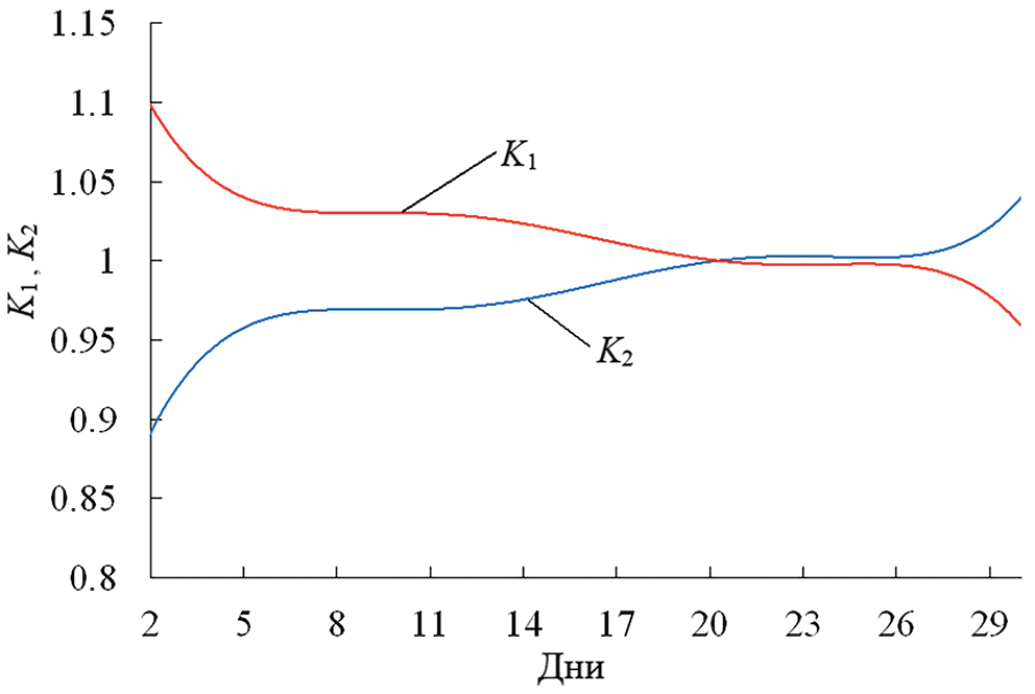 На рис. 8 приведены экспериментальные зависимости среднего уровня принятых сигналов с горизонтальной и вертикальной поляризациями за весь период измерений, а на рис. 9 - рассчитанные средние значения параметров K1 и K2 двухвибраторной модели рассеяния электромагнитных волн, при которых эти экспериментальные зависимости подтверждаются. Действительно, например, когда в период времени с 20 по 26 января средние значения рассчитанных коэффициентов передач двухвибраторной модели сравнимы, т.е. K1  K2 ≈ 1, тогда и средние значения амплитуд принятых ортогонально-поляризованных сигналов также сравнимы, Ex ≈ Ey. Параметры K1 и K2 рассчитывались по формулам (23), (24) с учетом принятой единичной интенсивности волны для случая q = 0, когда собственная система координат X O Y MathType@MTEF@5@5@+= feaahGart1ev3aaatCvAUfeBSjuyZL2yd9gzLbvyNv2Caerbov2D09 MBdbqedmvETj2BSbqefm0B1jxALjhiov2DaerbuLwBLnhiov2DGi1B TfMBaebbnrfifHhDYfgasaacH8Xrpu0dbbf9q8WrFfeuY=Hhbbf9v8 qqaqFr0xc9pk0xbba9q8WqFL0dir=xcvk9FHe9v8qqaq=dir=f0=yq aqVeLsFr0=vr0=vr0db8meaabaqaciaacaGaaeqabaWaaqaafaaake aaceWGybGbauaacaWGpbGabmywayaafaaaaa@3D47@  среды распространения совпадает с опорной XOY.