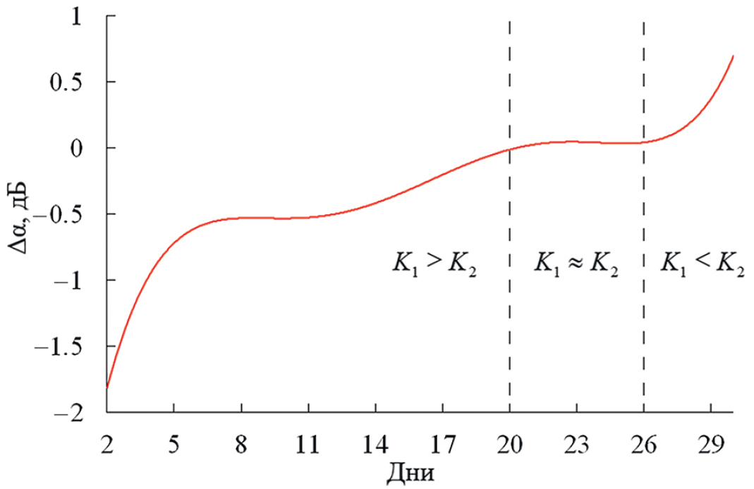 На рис. 10 приведена экспериментальная зависимость средних значений дифференциального амплитудного ослабления Δα за весь период измерений. Вертикальными штриховыми линиями обозначены границы временных интервалов измерений Δα для различных соотношений параметров K1 и K2 двухвибраторной модели рассеяния электромагнитных волн. Соотношение параметров модели, когда K1 > K2, соответствует отрицательным значениям дифференциального амплитудного ослабления Δα < 0. При K1K2 1 ослабление отсутствует, т.е. Δα0. Когда K1 < K2, ослабление принимает положительные значения: Δα > 0.