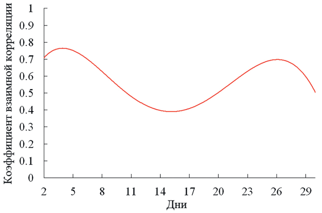 Результаты расчета коэффициента взаимной корреляции принятых ортогонально-поляризованных сигналов по сеансам за весь период измерений приведен на рис. 12. Значения коэффициента взаимной корреляции находились в диапазоне от 0.4 до 0.75, что в целом свидетельствует о средней корреляции принятых ортогонально-поляризованных сигналов.