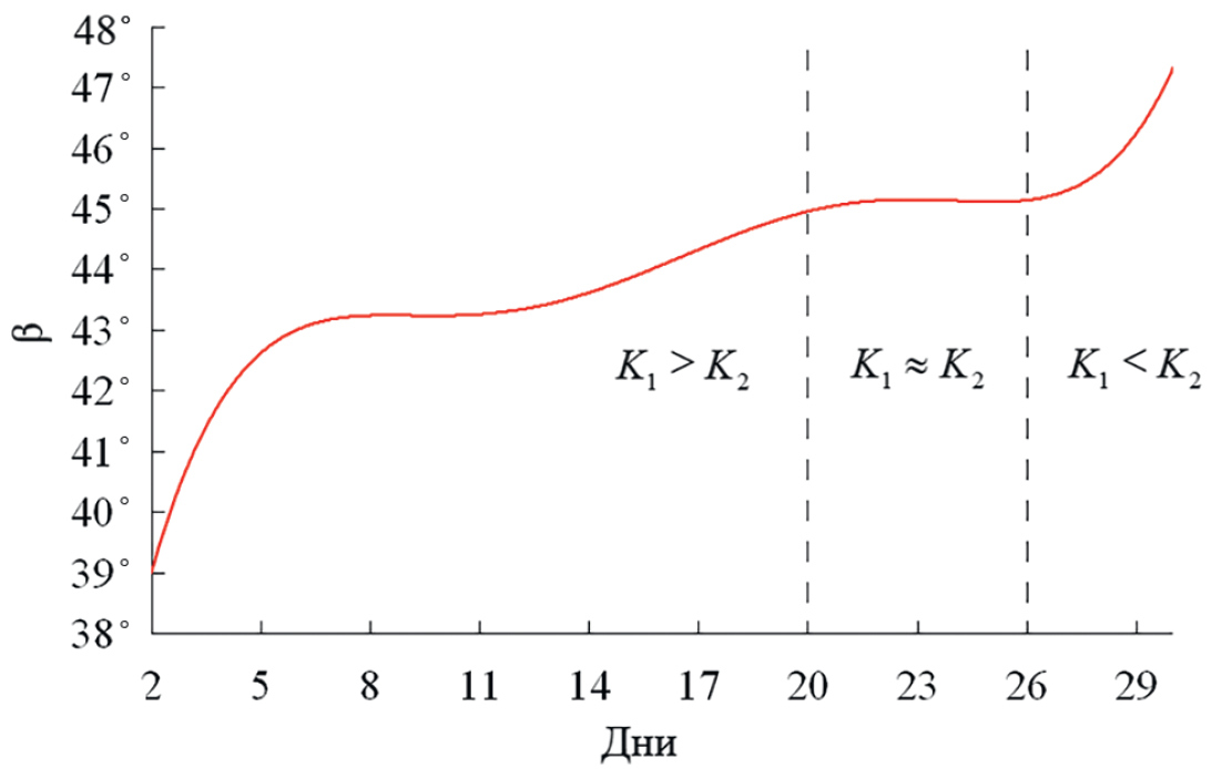 14. Fig. 13. Average values ​​of the orientation angle of the polarization ellipse β for the entire measurement period: K1 > K2 corresponds to values ​​β < 45°, at K1 ≈ K2 ≈ 1 the orientation angle β ≈ 45°, when K1 45°.