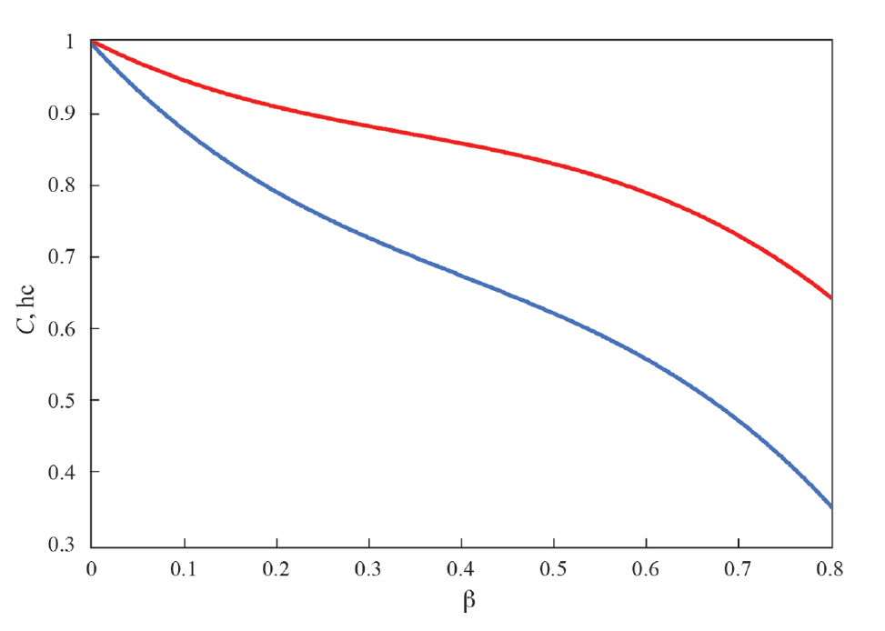 Рис. 4. Обобщающие зависимости корректирующих коэффициентов Chc для СУ 98/70 (синяя кривая) и СУ 70/50 мм (красная кривая) от объемного газосодержания β двухфазных потоков вода‒газ при давлении 0.5 MПа (5 бар).