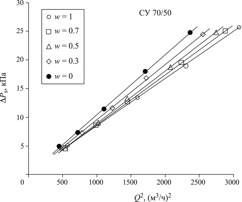 Рис. 7. Зависимости ∆Ps от квадрата расхода Q2 для смеси эксол‒вода в СУ 70/50 мм [3] при различных обводненностях w и давлении 0.5 МПа (5 бар).