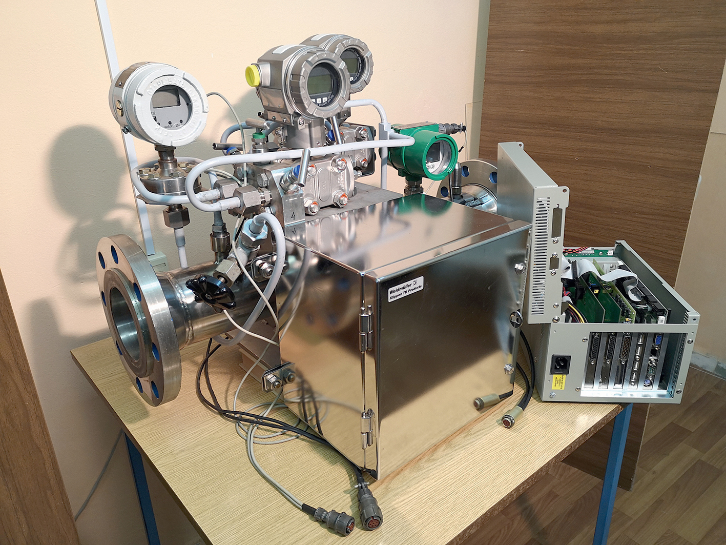 Размеры двухфазного расходомера, показанного на рис. 8, следующие: внутренний диаметр 98 мм, длина (расстояние между фланцами) 725 мм, высота по датчику перепада давления 460 мм, масса с блоком электроники на базе промышленного компьютера во взрывозащитном корпусе 67 кг, расчетное давление 100 бар. Для негорючих веществ целесообразно использовать обычный корпус 6-слотового промышленного компьютера (ПК) [18], который также показан на рис. 8 с открытой крышкой. В 6-слотовом ПК установлены стандартная процессорная плата и платы собственного производства [18] для измерения температур, сигналов датчиков со стандартными выходными токами 4‒20 мА (две двухканальных платы), плата 13-битного 8-канального цифро-аналогового преобразователя и при необходимости плата радиомодема. Связь с сервером осуществляется по Ethernet-кабелю посредством стандартного TCP/IP-протокола [19]. Дополнительная программа для реализации метода сеток посредством процессорной платы ПК написана на языке С++.