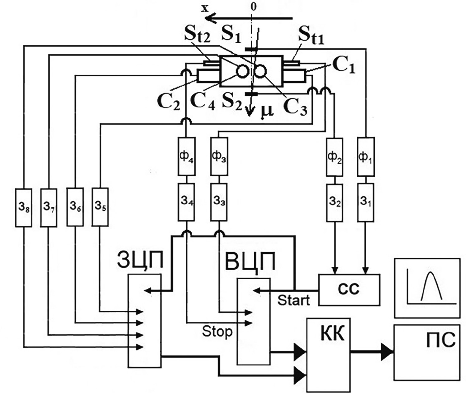 Рис. 2. Блок-схема калибровки сцинтилляционного амплитудно-координатного спектрометра: S1 и S2 — триггерные сцинтилляционные счетчики, C1 — C4 — амплитудная система, St1 и St2 — координатная система, Ф1 — Ф8 — блоки формирователей, З1 — З4 — блоки задержек, СС — схема совпадений, ЗЦП — зарядо-цифровой преобразователь, ВЦП — время-цифровой преобразователь, Start — сигнал запуска блоков ЗЦП и ВЦП, Stop — временные сигналы со счетчиков координатной системы St1 и St2, КК — крейт-контроллер системы CAMAC, ПС — персональный компьютер.