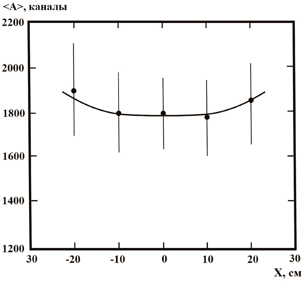 На рис. 3 представлена зависимость средней суммарной амплитуды четырех каналов САКС от точки входа космических мюонов в спектрометр. Видно, что диапазон изменений суммарной амплитуды между минимальными и максимальными значениями в центре спектрометра и боковыми гранями составляет около 500 каналов. В пределах ошибок зависимость средней суммарной амплитуды каналов САКС от точки входа космических мюонов в спектрометр можно считать линейной. Аналогичная зависимость наблюдалась в работе [7].