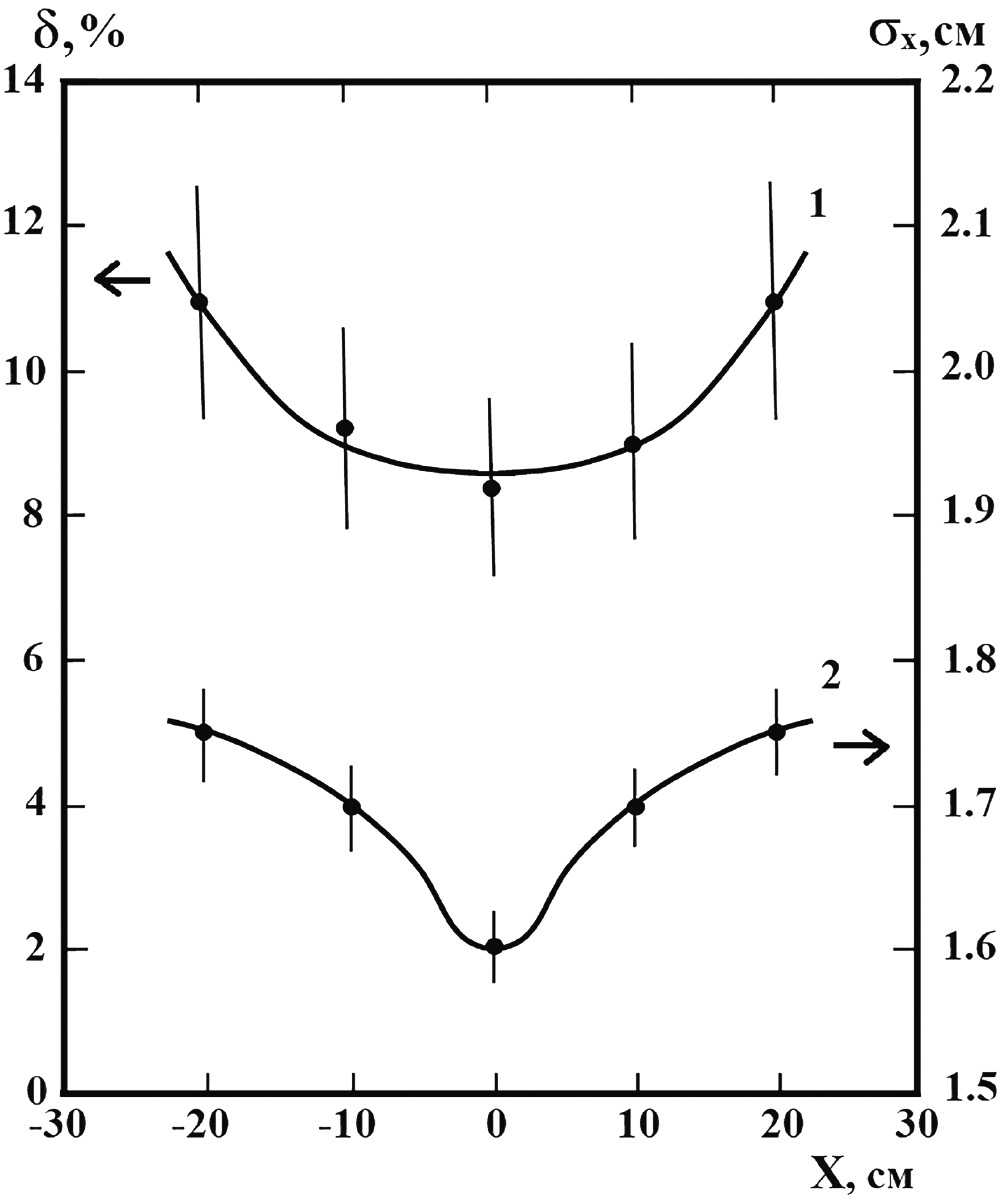 На рис. 4 представлены зависимости относительного амплитудного δ (кривая1) и координатного σx (кривая 2) разрешений САКС также от положения триггерных счетчиков на оси x. Видно, что характер изменения обеих зависимостей одинаков с минимальными соответствующими значениями δ = 8.7% и σx = 1.6 cм в центре спектрометра (x = 0). В обоих случаях δ и σx ухудшаются при приближении триггерных счетчиков к боковым граням САКС до значений δ ~ 11% и σx ~ 1.8 см соответственно.