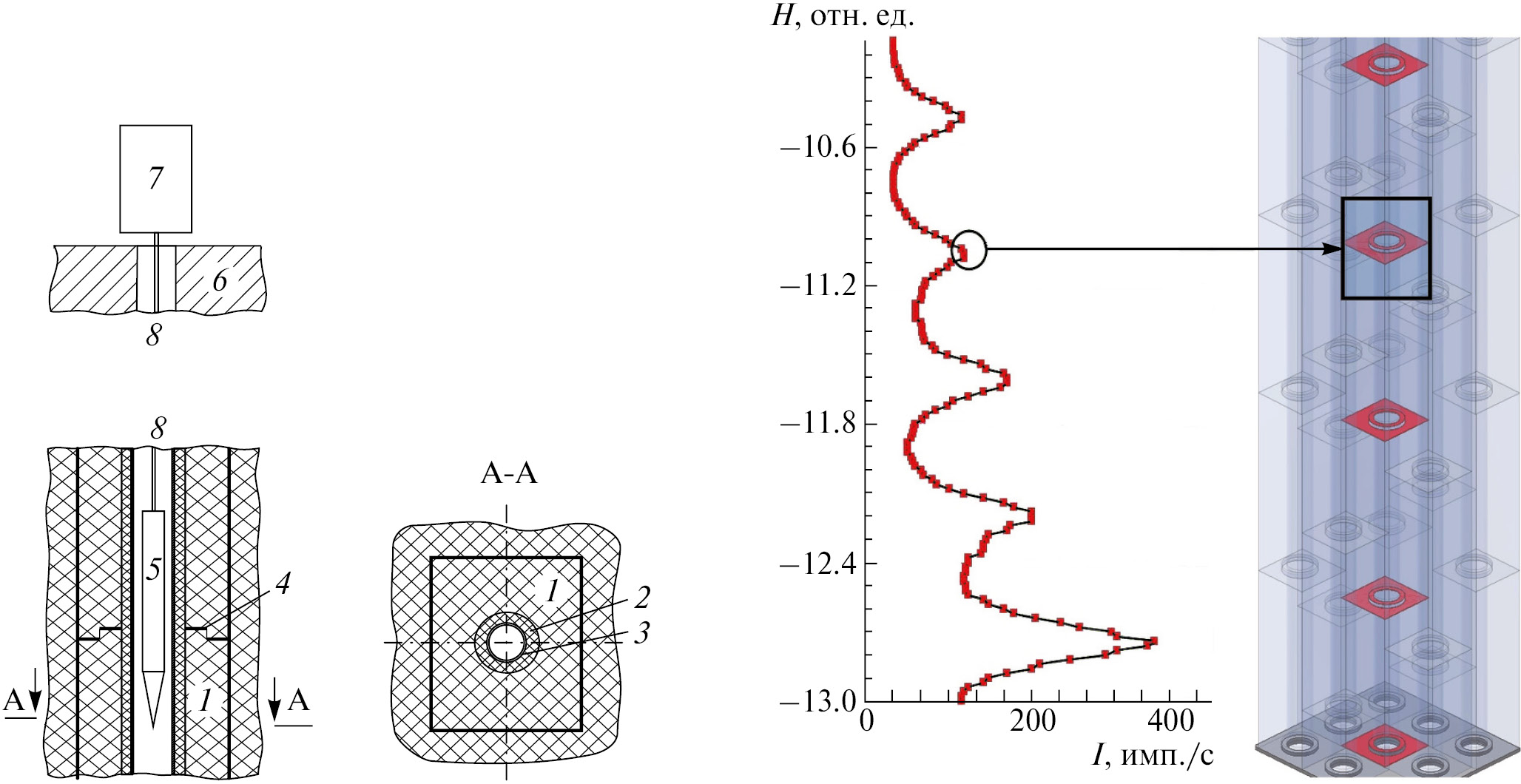 Рис. 7. Схема сканирования и результаты определения отметок локализации радионуклидов топливного происхождения по высоте H графитовой кладки: 1 — графитовый блок, 2 — графитовая втулка, 3 — технологический канал, 4 — межблочный стык, 5 — детектор, 6 — верхние металлоконструкции, 7 — блок сканирования, 8 — линия связи (кабель).