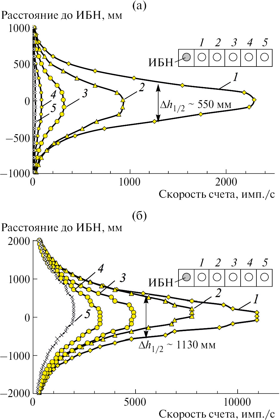 Для определения пространственной разрешающей способности детекторов нейтронов и влияния интерференции нейтронов от двух независимых источников нейтронов в эксперименте применялись два идентичных по характеристикам Pu–Be-источника. Измерения по высоте с помощью ДНН и ДТН проводились в соседней ячейке. Расстояние ∆h между источниками по высоте изменялось с шагом 100 мм, что позволило получить распределение от двух источников, расположенных относительно друг друга на разных расстояниях.
