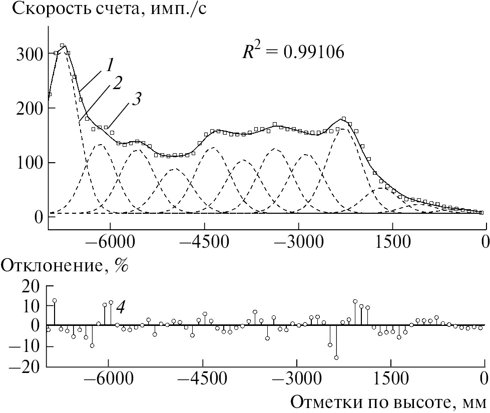 Рис. 11. Пример разложения интегрального распределения потока надтепловых нейтронов на отдельные одиночные распределения Гаусса: 1 — расчетное распределение, 2 — распределение Гаусса, 3 — экспериментально полученное распределение, 4 — величина отклонения между расчетным и экспериментальным распределениями, R2 — коэффициент детерминации.