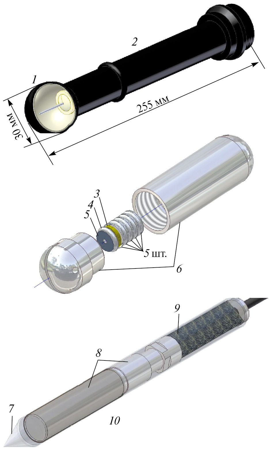 Рис. 14. γ-детекторы: БДМГ-48 (сверху), ИКС-А (по центру), ГАММА-Р (снизу), использованные при сличительных измерениях в конструкциях остановленного реактора: 1 — рабочая (поглощающая) часть детектора, 2 — основная часть детектора, 3 — пластина из термолюминесцирующего алюмофосфатного стекла, 4 — капсула из алюминия, 5 — свинцовый фильтр, 6 — контейнер, 7 — чехол, 8 — ионизационная камера КГ-10, 9 — предусилитель, 10 — свинцовый фильтр.
