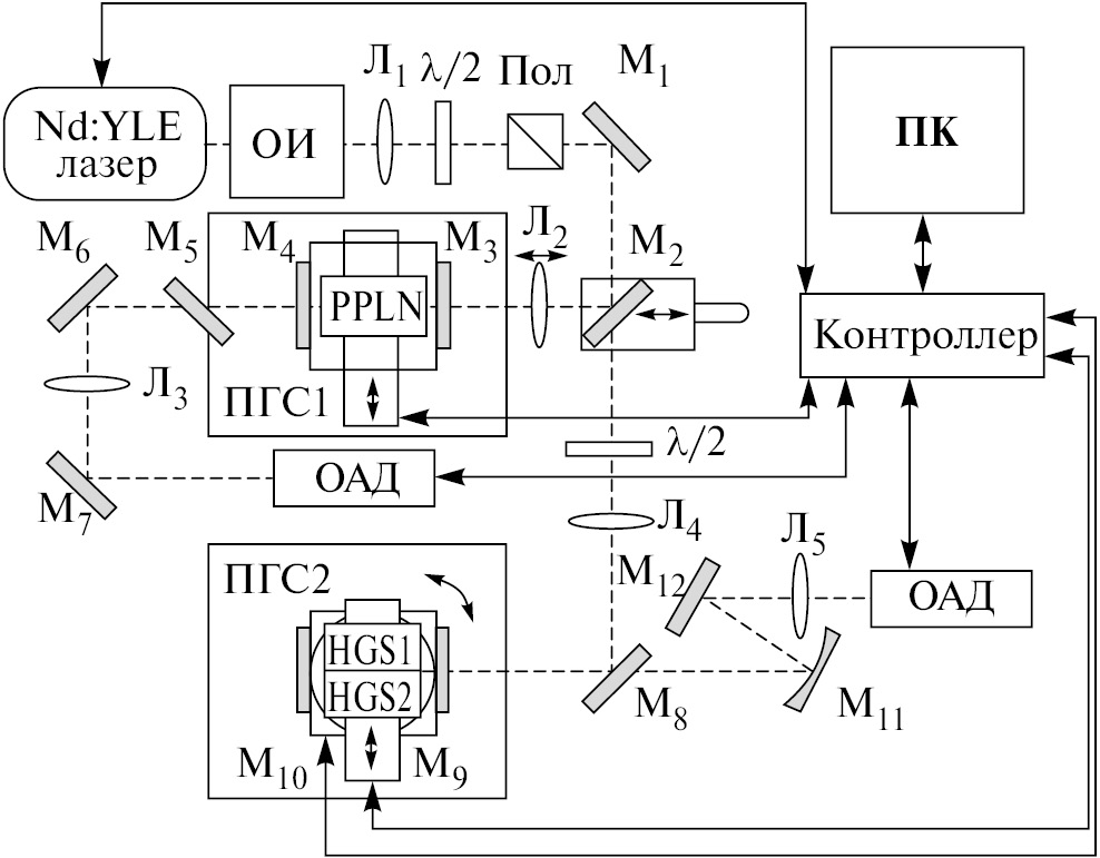 Экспериментальная установка представлена на рис. 1. В качестве источника накачки используется Nd:YLF-лазер c длиной волны 1.053 мкм (TECH-1053 Advanced) с длительностью импульса около 6 нс. Полуширина линии излучения равняется 227 пм (около 2 см–1). Частота следования импульсов может изменяться от 0.1 до 4 кГц. Оптический изолятор (ОИ) Фарадея используется для устранения обратной связи от оптических элементов. Для плавного регулирования мощности используется аттенюатор, состоящий из полуволновой пластинки (λ/2) с призмой Глана (Пол). Для согласования режимов лазера накачки и ПГС используется линза Л1 с фокусным расстоянием 300 мм.