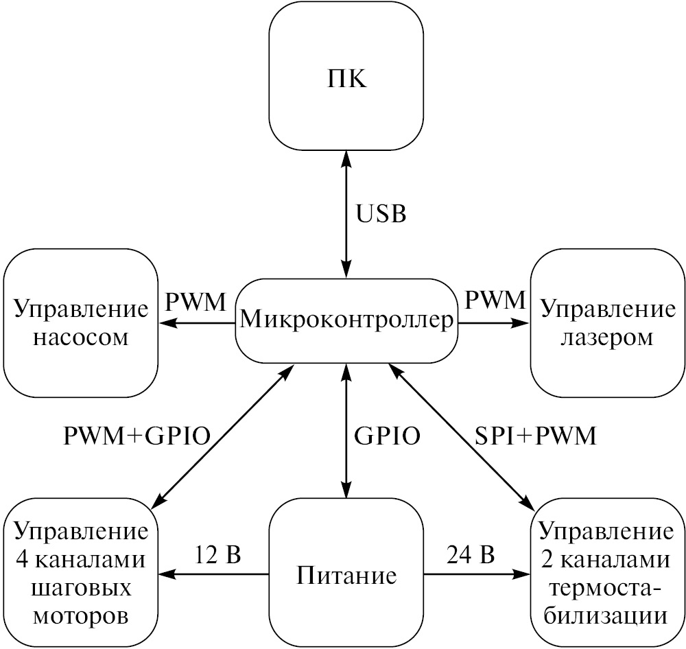Используя концевые выключатели и оптические датчики, система измерения обеспечивает хорошую точность и повторяемость. Они служат для определения начальной координаты и точного положения относительно нее. Концевые выключатели и оптические датчики от каждой моторизованной подвижки подключены к микроконтроллеру. С помощью компьютера можно программно регулировать диапазоны и скорость движения каретки для каждого из драйверов шаговых двигателей. Для управления всеми элементами измерительного комплекса и сбора данных используется 8–16-битный микроконтроллер (ATXMega128) с тактовой частотой 32 МГц. Он способен независимо управлять линейными и поворотными моторизованными подвижками (до 4 штук включительно), двумя каналами термостабилизации держателей кристаллов, двумя каналами откачки пробы газа и внешним лазером. Контроллер обеспечивает питание всех подсистем через встроенный блок питания. Структурная схема контроллера ПГС представлена на рис. 2. Управление микроконтроллером осуществляется через интерфейс USB с помощью внешних команд, передаваемых с персонального компьютера (ПК) по фирменному протоколу связи. Программное обеспечение на компьютере позволяет контроллеру выполнять все необходимые операции по откачке, анализу и удалению пробы газа в измерительном комплексе.