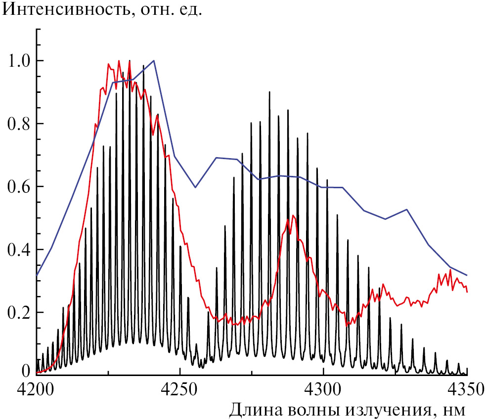 Рис. 4. Экспериментально измеренный спектр поглощения газовой смеси на основе азота с углекислым газом (N2 + 1000 ppm CO2) (красная кривая) в сравнении с данными базы данных HITRAN (черная кривая) и спектром, полученным с помощью масс-спектрометрии (синяя кривая).