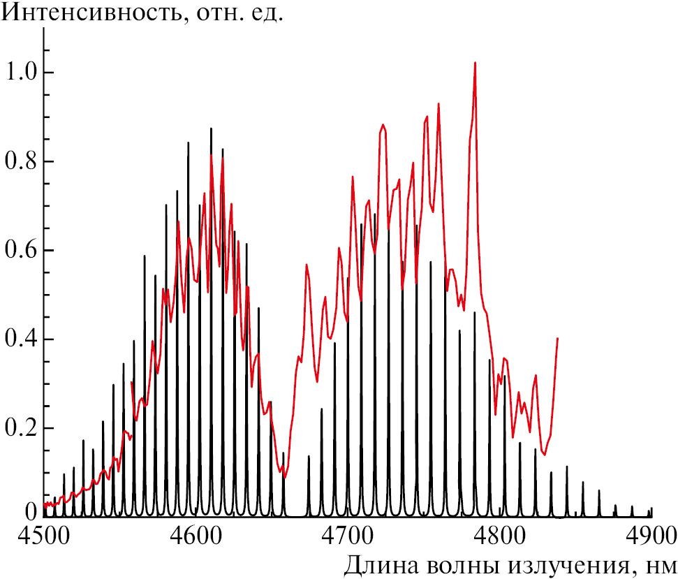 Рис. 5. Экспериментально измеренный спектр поглощения газовой смеси на основе азота с примесью оксида углерода (N2 + 152 ppm CO) (красная кривая) в сравнении с данными базы данных HITRAN (черная кривая).