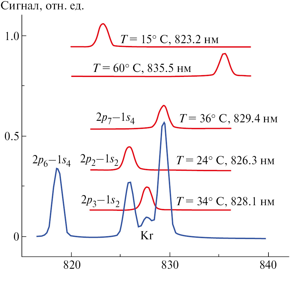 На рис. 2 представлена часть эмиссионного спектра криптона, зарегистрированная с помощью спектрометра AvaSpec-3648 в излучении разрядной ячейки. На спектр Kr наложены пять спектров излучения ДЛКВР, которые были записаны при различных температурах излучателя и токе накачки около 50 мА. Лазерные спектры в верхней части рис.2, полученные при минимальной Tmin = 15 °С (точка росы) и максимальной Tmax = 60 °С (определена производителем) температурах излучателя, демонстрируют доступный спектральный интервал величиной Δl = 12.3 нм, центрированный на 829 нм. Вычисленный по данным рис. 2 коэффициент дискретной температурной перестройки диодного лазера равен ∂l/∂T = 0.27 нм/°С, что согласуется с паспортным значением 0.23 нм/°С. Настройки ДЛКВР на три линии Kr, которые попадают в перекрываемый спектральный диапазон, демонстрируют лазерные спектры на рис. 2 и сигналы на рис. 3, пропорциональные интенсивности лазерного пучка, прошедшего через разрядную трубку.