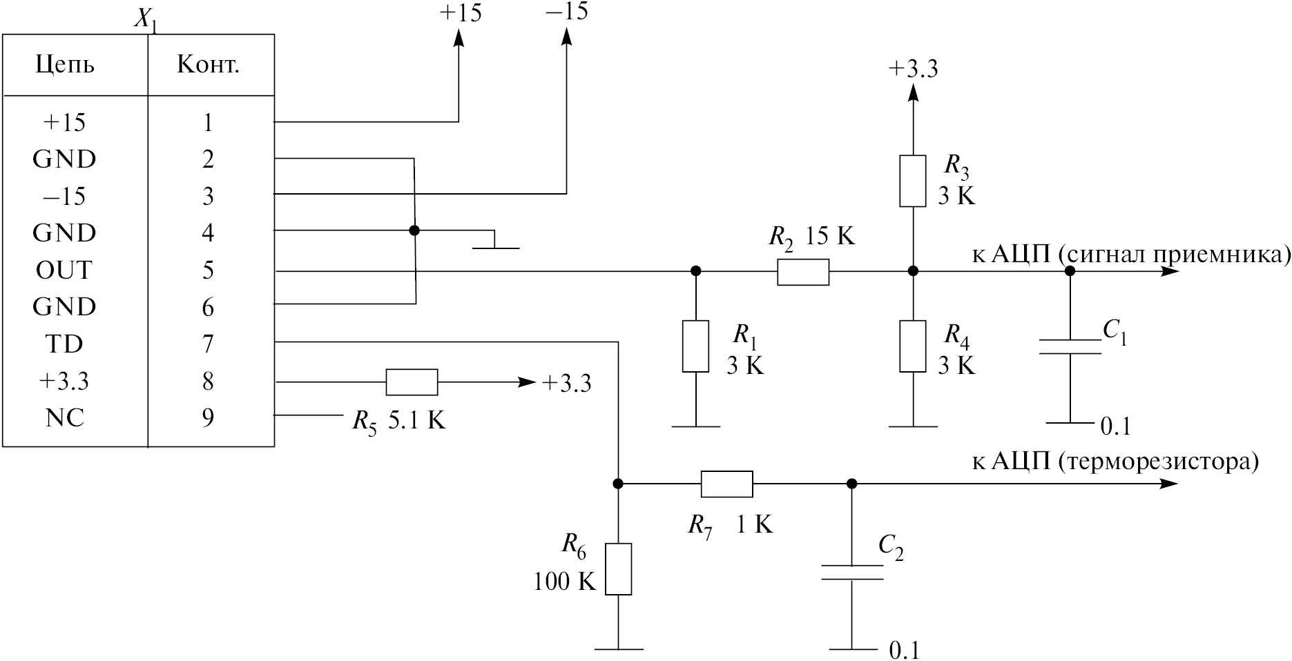 Электронная часть ОАП представляет собой пару фотодиод–светодиод (ФД-24К и 3Л107Б соответственно) и терморезистор RT (ТМ-293-06), сопротивление которого при 0°C составляет 500 Ом [18]. Данный терморезистор необходим для контроля температуры ОАП, он установлен непосредственно на его корпус. На терморезистор RT подается напряжение 3.3 В через резистор R5. Таким образом формируется резистивный делитель, средняя точка которого является выходом датчика температуры.