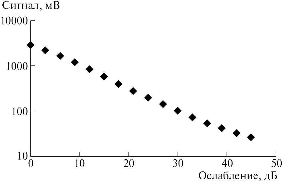 В ходе измерений также была проверена линейность регулировки усиления встроенным в микросхему аттенюатором. На рис. 4 представлена зависимость выходного сигнала от установки аттенюатора.