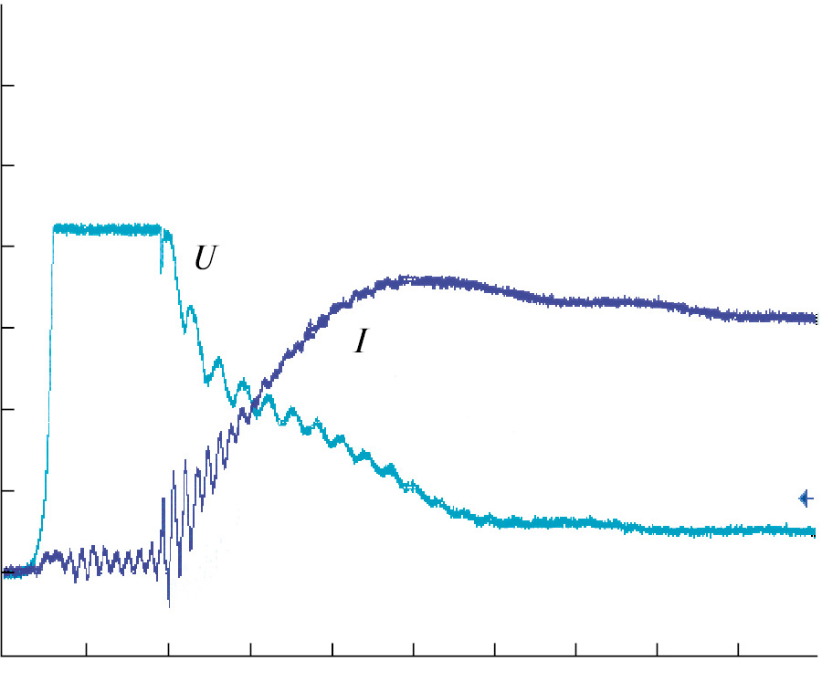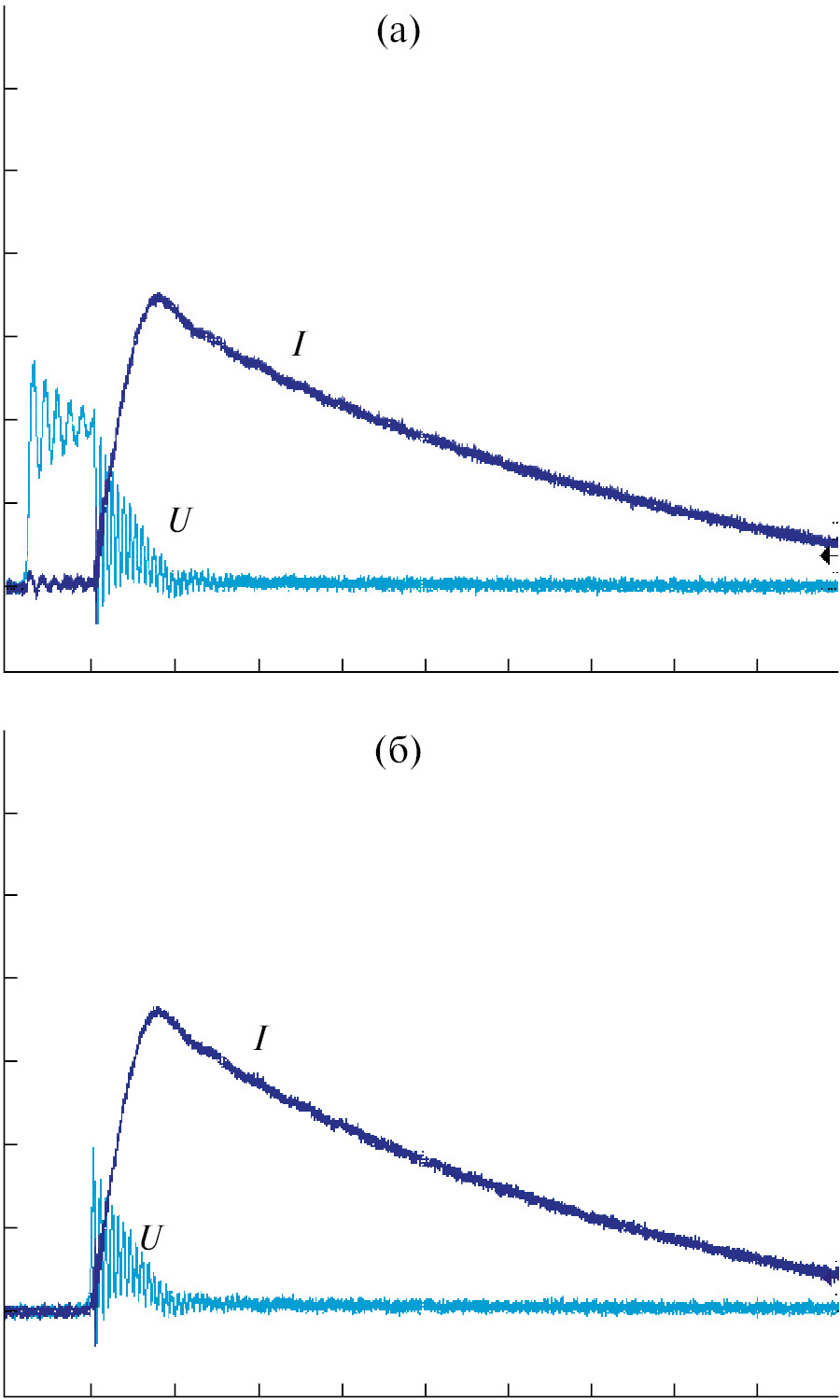 На рис. 5а, б приведены осциллограммы выходного тока I и напряжения U на разрядной камере, полученные в рассмотренном режиме в произвольно выбранные моменты времени. Ток I измерялся датчиком тока ДТ1 (см. рис. 1), а напряжения U — щупом Tektronix P6015A.