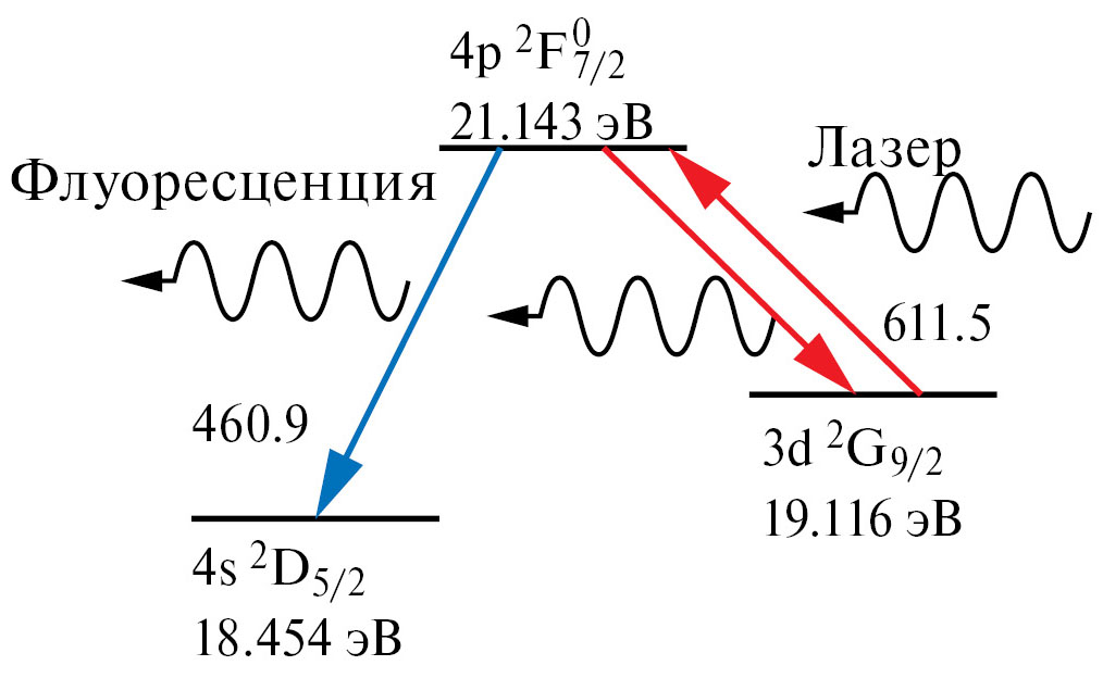 5.1.1. Лазерно-индуцированная флуоресценция (ЛИФ) является методом активной оптической диагностики, ее принцип действия основан на применении монохроматического излучения лазеров с целью стимулирования квантовых переходов между вполне определенными уровнями [7]. Методика ЛИФ позволяет проводить измерение концентрации и температуры различных частиц плазмы (атомов и ионов) с высокими спектральным, пространственным и временным разрешениями. Разделение объектов происходит за счет возбуждения различных переходов в атомах и ионах. Использование перестраиваемых по длинам волн лазеров с узкой линией лазера позволяет селективно возбуждать строго определенные переходы, тем самым обеспечивая взаимодействия исключительно с выбранными для диагностики объектами (атомами и ионами). В работах на стенде ПН-3 активно использовалась, к примеру, следующая схема для ионов аргона (ArII) (рис. 5): накачка флуоресцентного излучения осуществлялась из метастабильного состояния 3d2G9/2 при помощи лазерной линии λlaser = 611.5 нм, при этом сигнал флуоресценции регистрировался на линии λflu = 460.9 нм (переход 4p2F7/2 → 4s2D5/2). Для интерпретации флуоресцентного сигнала использовалась столкновительно-излучательная модель, подобная приведенным в работах [8, 9]. С помощью ЛИФ можно измерять распределение концентрации атомов и ионов плазмы вдоль лазерного луча.