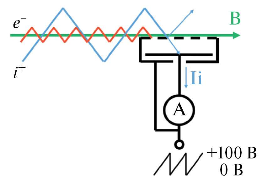 Особое внимание следует уделить одной из модификаций так называемого ионного зонда (ion sensitive probe) [13]. Он представляет собой корпус, передняя стенка которого выполнена из мелкой сетки, внутрь него помещен коллектор. При измерении зонд располагается строго параллельно силовым линиям (принципиальную схему измерения см. на рис. 7). Тогда те электроны, которые теоретически могли бы попасть на коллектор, “гибнут” на корпусе. А ионы, ввиду того что их ларморовский радиус на несколько порядков больше электронного, способны пройти сквозь сетку и достигнуть коллектора. Это гарантирует то, что на коллектор будет попадать чисто ионный поток. Подавая на зонд переменный положительный потенциал, мы создаем для ионов потенциальный барьер, аналогично тому, как это делается в сеточном анализаторе (см. ниже). Значит, измеряя при этом ток, текущий через коллектор, мы получим кривую запирания зонда, продифференцировав которую, мы найдем функцию распределения ионов по энергиям вращательного движения. Следует отметить, что коллектора достигнут только ионы, имеющие ларморовский радиус, превышающий расстояние от сетки до коллектора. Таким образом, существует минимальная вращательная энергия ионов, которую может зарегистрировать зонд. В реальных конструкциях зондов эта энергия обычно существенно ниже 1 эВ.