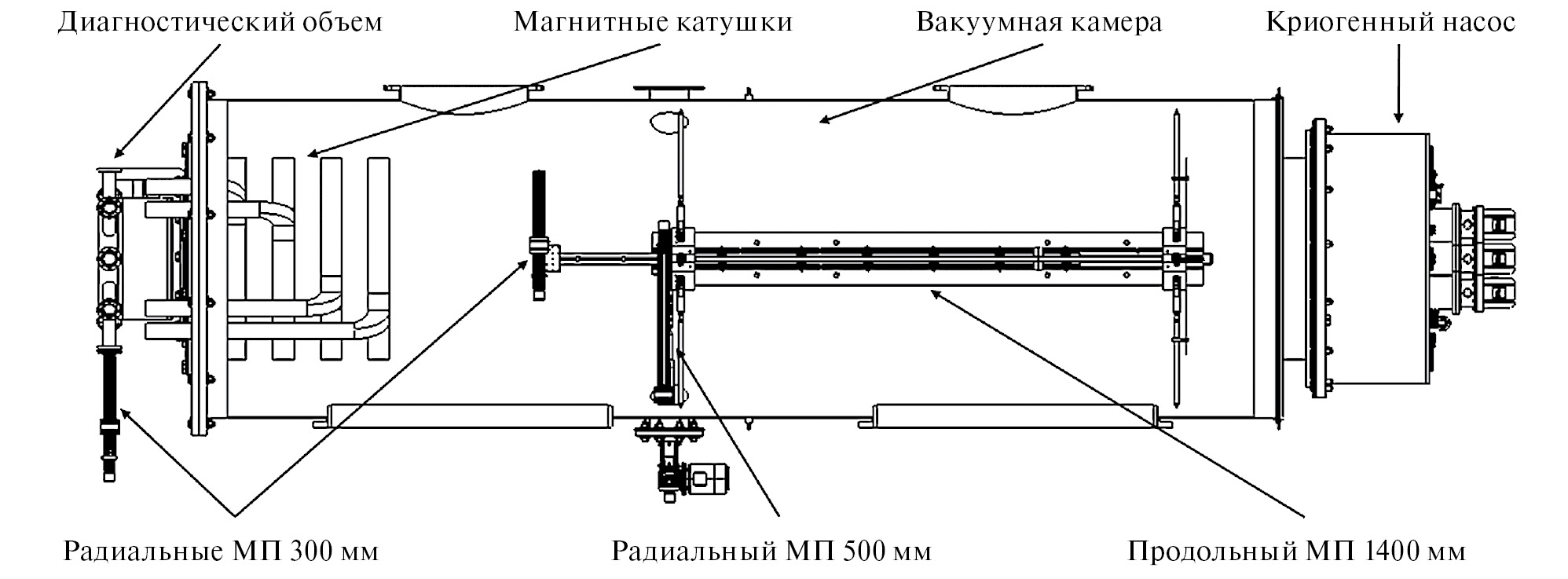Далее плазменный поток покидает ГРК и попадает в вакуумную камеру, служащую для имитации вакуумных условий космического пространства. В ней располагается большая часть МС; вакуумная откачка рабочего газа из камеры осуществляется мощным криогенным насосом. Камера представляет собой цилиндрический объем с внутренним диаметром 1.2 м и длиной 4 м. На входе в МС на торце ГРК располагается диагностический объем, предназначенный для установки различных плазменных диагностических устройств для исследования параметров плазменного потока на входе в МС.