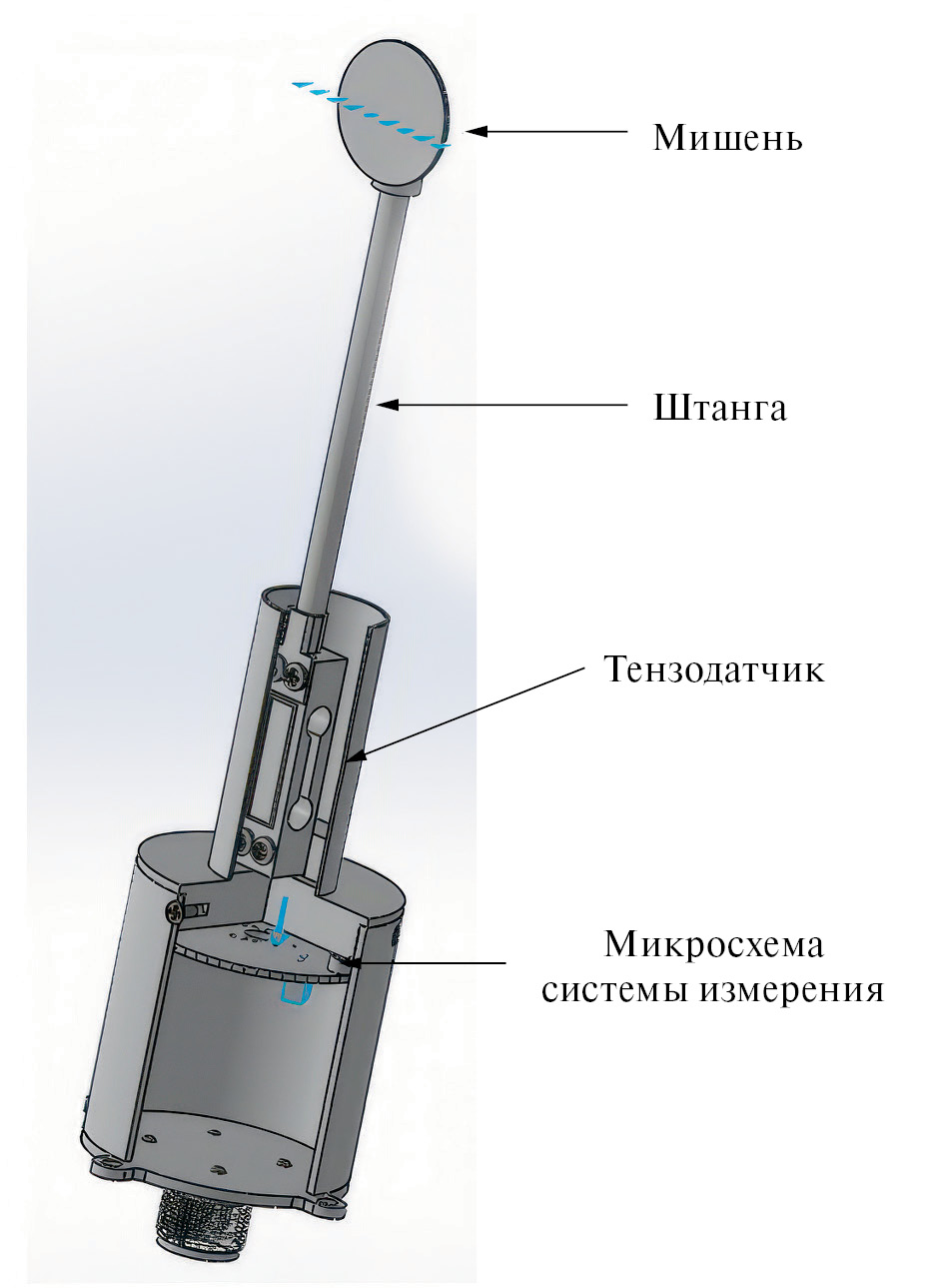 Такой тягомер принципиально состоит из мишени, прикрепленной посредством штанги к тензодатчику, жестко закрепленному на неподвижном корпусе. Площадь мишени (и длина штанги) выбираются, исходя из ожидаемой плотности тяги и чувствительности тензодатчика. 3D-модель одной из конструкций такого тягомера приведена на рис. 11.