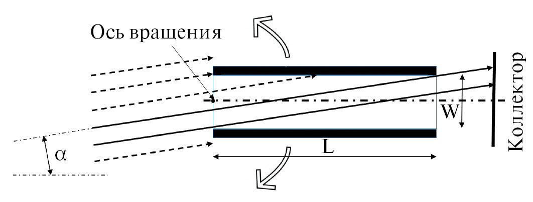 5.3.1. Угломер. Сорвавшись с силовых линий магнитного поля, ионы плазменного потока движутся по прямолинейным траекториям. Для измерения локального угла этого движения ионов используется угломер. Он представляет собой щелевой канал (коллиматор), вращающийся вокруг оси, расположенной на одном из его торцов. Напротив другого торца располагается коллектор. Если ось канала совпадает с направлением движения ионов, то они, пройдя весь, канал, попадают на коллектор; в противном случае ионы ударяются в одну из стенок. Величина тока, текущего через коллектор, будет пропорциональна числу частиц, двигающихся под данным углом. Принципиальная схема угломера приведена на рис. 12.