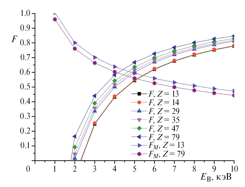 Здесь учитывается, что η(EB) – возрастающая функция при Z > 35, убывающая при Z < 35 и не зависит от EB при Z ≈ 35 [12]. Рассчитанные по соотношению (2) графики для ряда химических элементов приведены на рис. 1.