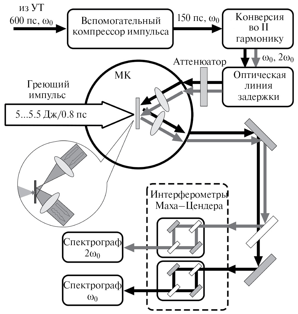 Принципиальная схема постановки экспериментов представлена на рис. 1. Зондирующий пучок организован путем ответвления части энергии (50–70 мДж) рабочего излучения из усилительного тракта (УТ) лазерной установки. В схеме измерения реализована трансляция изображения зондирующего пучка, имеющего гладкий профиль интенсивности, по ключевым элементам тракта, включая поверхность мишени и щели спектрографов. Длительность чирпированного импульса в канале зондирования при помощи вспомогательного компрессора сокращалась с первоначальных τЧИ = 600 пс до 150 пс. Форма спектра импульса близка к гауссовой с шириной на половине высоты, равной 3 нм. Далее импульс направлялся в линию конверсии излучения во вторую гармонику на кристалле KDP с I-типом фазового синхронизма. Энергетический коэффициент преобразования излучения в 2ω0 составлял 10%.