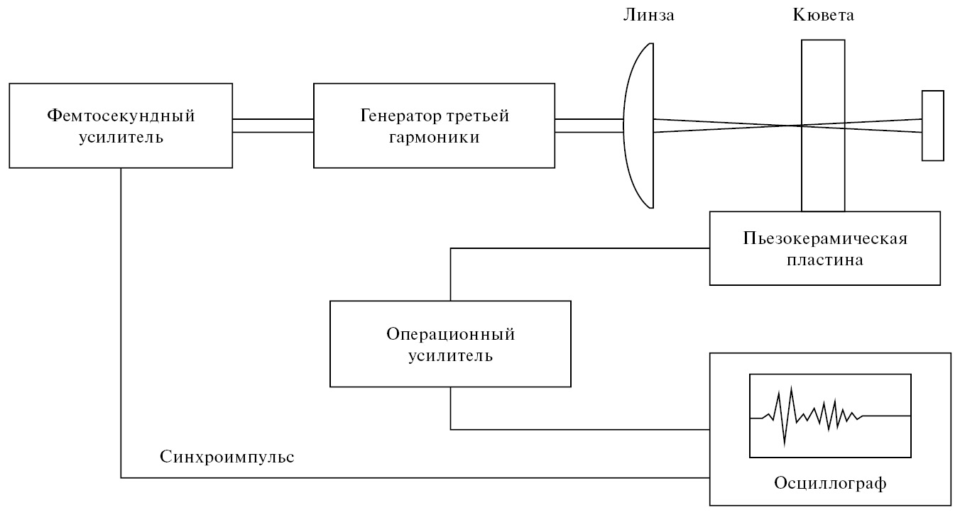 Излучение третьей гармоники на выходе генератора имело вид круглого пучка диаметром 4 мм. Лазерный пучок далее фокусировался цилиндрической линзой с фокусным расстоянием 250 мм и направлялся в кварцевую кювету высотой 45 мм с внутренним поперечным размером 10×10 мм2. Кювета заполнялась исследуемым раствором и располагалась на некотором удалении от фокуса цилиндрической линзы, чтобы избежать нелинейных и термических эффектов. Цилиндрическая линза использовалась с целью создания в образце области тепловыделения в виде широкой, но не очень толстой области для минимизации дифракционной расходимости акустического сигнала. Облучаемая лазерным излучением область раствора в итоге имела ширину около 4 мм, толщину (высоту) около 2 мм, а ее длина соответствовала ширине кюветы 10 мм. В процессе измерений с разными растворами все части установки оставались в том же положении, а оптическая плотность растворов выбиралась одинаковой, чтобы обеспечить для разных образцов равные условия для генерации оптоакустических сигналов.