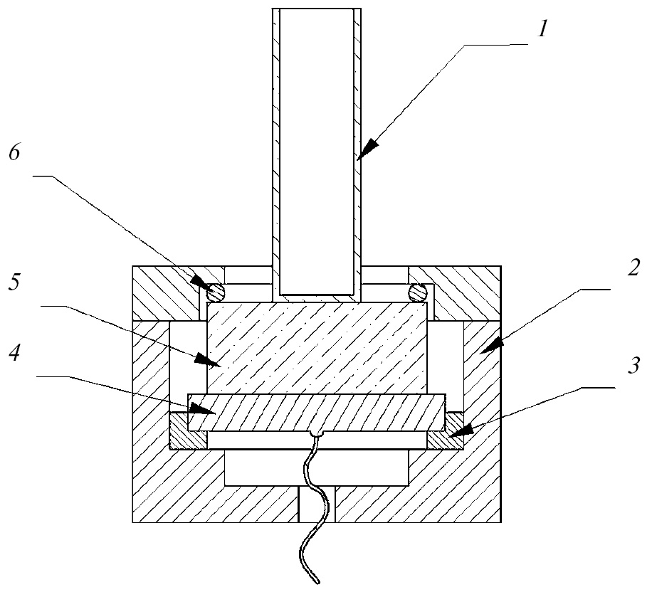 Рис. 2. Схема узла пьезодатчика: 1 – кварцевая кювета, 2 – корпус, 3 – тефлоновая прокладка, 4 – керамический пьезоэлектрический преобразователь, 5 – кварцевая пластина, 6 – резиновая прокладка.