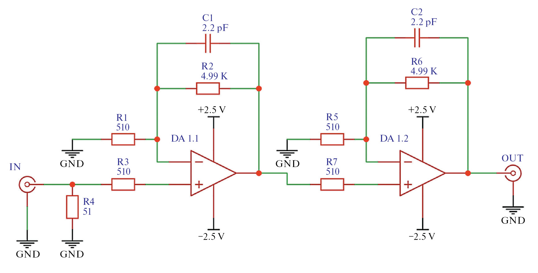 Для улучшения отношения сигнал/шум был разработан операционный усилитель с коэффициентом усиления 100 и полосой пропускания от 0 до 10 МГц. Принципиальная схема операционного усилителя представлена на рис. 3.