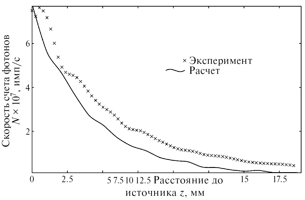 При сравнении результатов расчетов с экспериментальными данными можно отметить хорошее качественное совпадение. Количественное расхождение следует отнести на несовершенство модели и условий проведения экспериментов. В частности, фоновые значения скорости счета фотоприемника оказались выше учитываемых в модели. Количественное расхождение экспериментальных и расчетных значений может быть связано также с неравномерностью поверхностного выхода реального источника бета-излучения, что может быть обусловлено, например, неравномерностью распределения радиоизотопа внутри образующего источник слоя вещества. Описанная модель источника предполагает равномерность радиационного выхода с поверхности источника.