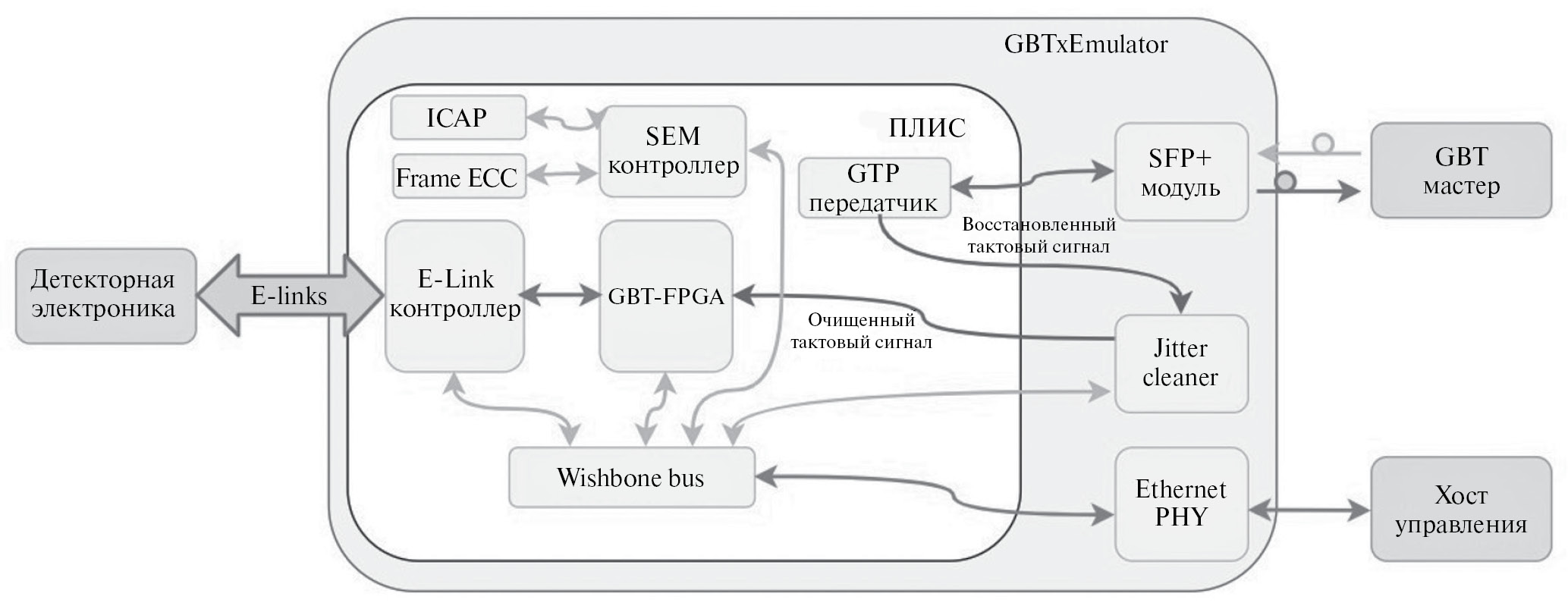 Все модули GBTxEmulator управляются через адресную шину регистров под названием “Wishbone bus”. До установления соединения по протоколу GBT для автономного управления устройством используется минималистичный синтезируемый процессор “J1B”. Тактовый сигнал в конечном итоге восстанавливается из оптической линии связи с помощью микросхемы очистки от джиттера фирмы Silabs. Дополнительный интерфейс медленного управления по протоколу IPbus [9] реализован с применением модуля Ethernet PHY. Его можно использовать при отладке, а также как альтернативу протоколу GBT для управления по медленному каналу и мониторинга считывающей электроники. Для обнаружения и исправления сбоев в конфигурационной памяти ПЛИС путем взаимодействия с встроенными системными модулями ICAP и FRAME ECC в модуль GBTxEmulator был интегрирован блок SEM-контроллера [10].