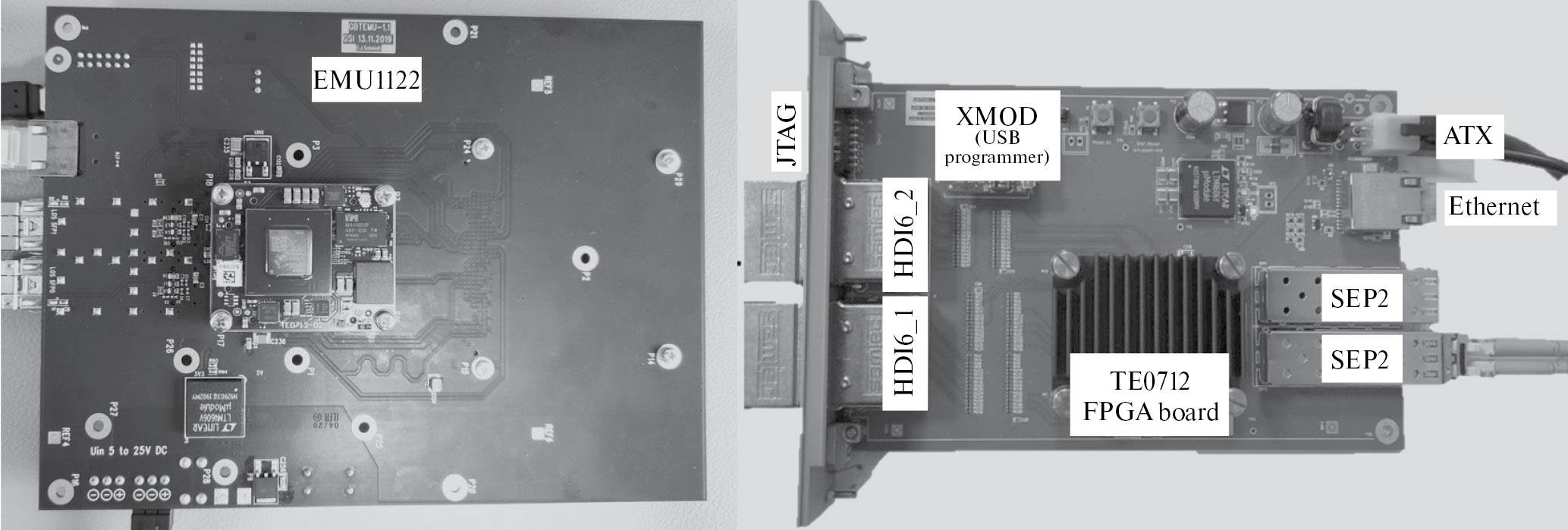 Фотографии модуля GBTxEmulator в версии прототипа и финальной версии представлены на рис. 2. Прототип имеет более гибкий функционал благодаря разъему FMC, на который можно устанавливать мезонинные модули с различными интерфейсами ввода-вывода. Это полезно при отладке устройства и расширяет область его применения для чтения других устройств, совместимых с GBTx. Финальная версия отличается компактными размерами, выполнена в стандарте Евромеханика 3U, имеет эргономичное расположение выводов и обеспечивает согласованность и высокое качество дифференциальных линий связи с детекторной электроникой. Размещение высоких компонентов на одной стороне позволило в два раза уменьшить высоту платы до 6 HP, что важно при компоновке крейтов.