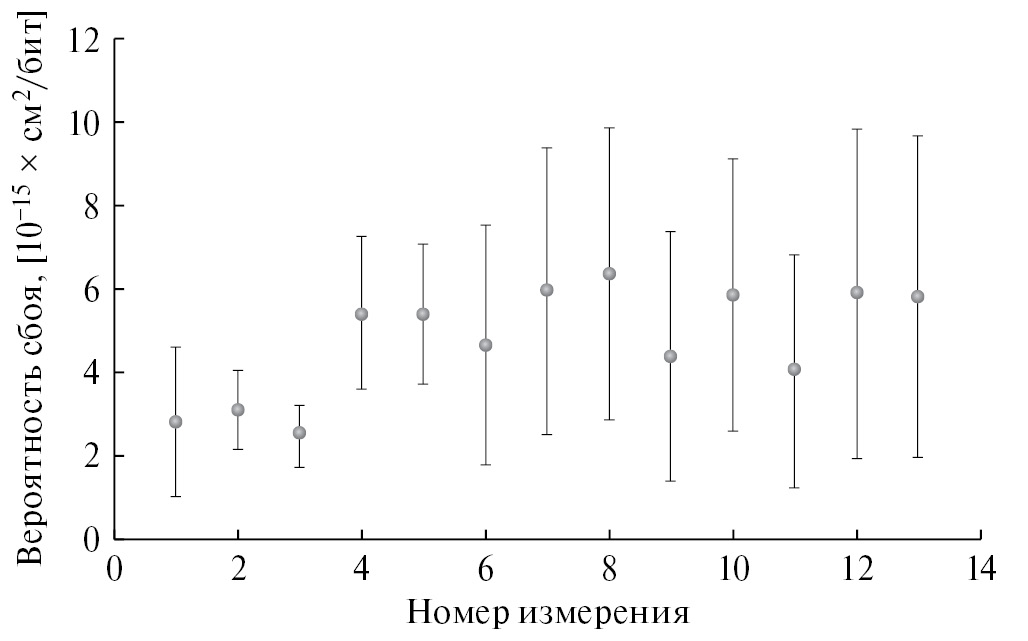 Результирующее усредненное по серии всех отдельных испытаний значение вероятности сбоя в отдельном бите CRAM составило (3.94 ± 2) ∙ 10–15 см2/бит.
