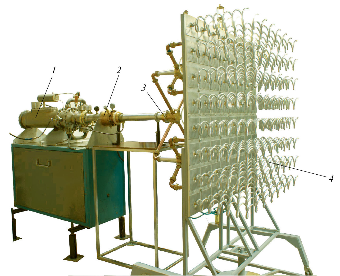Рис. 1. Внешний вид источника СШП-излучения: 1 – генератор высоковольтных монополярных импульсов СИНУС-200, 2 – формирователь биполярных импульсов, 3 – делитель мощности, 4 – решетка спиральных антенн.