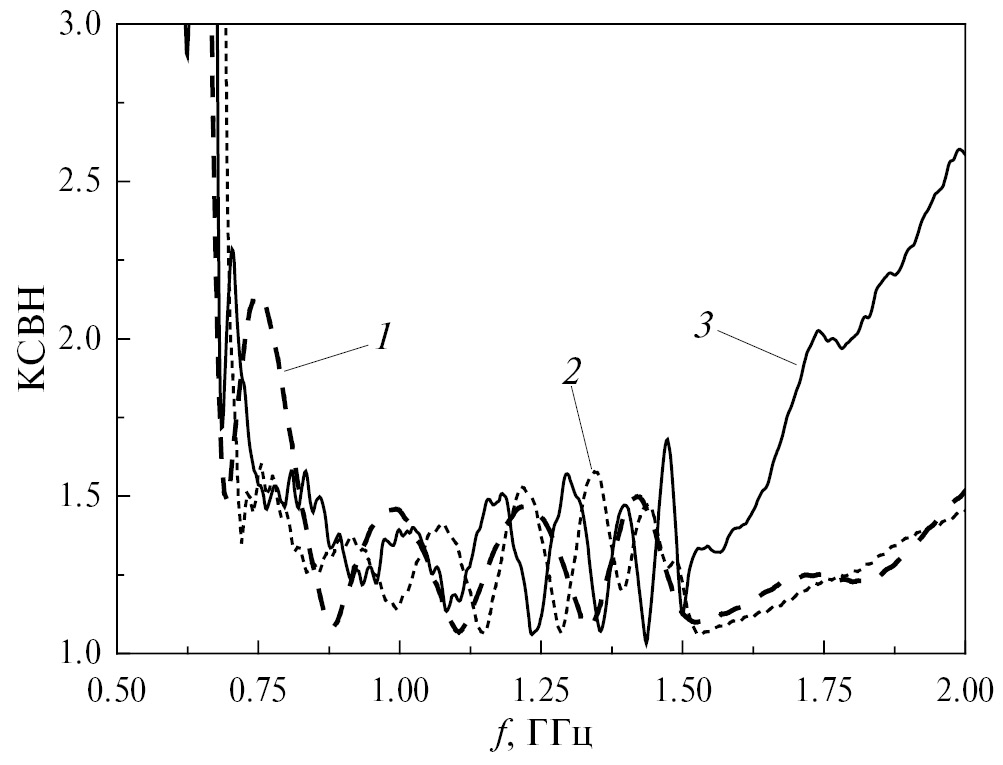 Для более детального сравнения антенн с N = 3 и N = 6 были выполнены расчеты КСВН, диаграмм направленности и оценки величин kE , kw . Для антенны с N = 6 были выполнены также измерения этих характеристик. На рис. 3 приведены рассчитанные зависимости КСВН от частоты для антенн с N = 3 (кривая 1) и N = 6 (кривая 2). Различие КСВН (кривые 1 и 2) наблюдается в области низких частот. Здесь также показаны результаты измерения КСВН для антенны с N = 6 (кривая 3). Существенное различие рассчитанного и измеренного КСВН (кривые 2 и 3) в области частот более 1.5 ГГц обусловлено конструкцией конического перехода от входа антенны к кабельному разъему. Измерения КСВН проводились с помощью Network Analyzer Agilent N5227A.