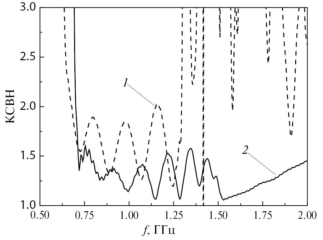Первоначально рассчитывался КСВН элемента бесконечной решетки. Затем по результатам расчетов оценивалась величина kw . На рис. 6 показан КСВН элемента бесконечной решетки при d = 18 см (кривая 1) и для сравнения приведен расчетный КСВН одиночной антенны (кривая 2). Видно, что для элемента решетки величина КСВН увеличилась, а нижняя граничная частота при КСВН = 2 сдвинулась на 50 МГц в сторону низких частот.