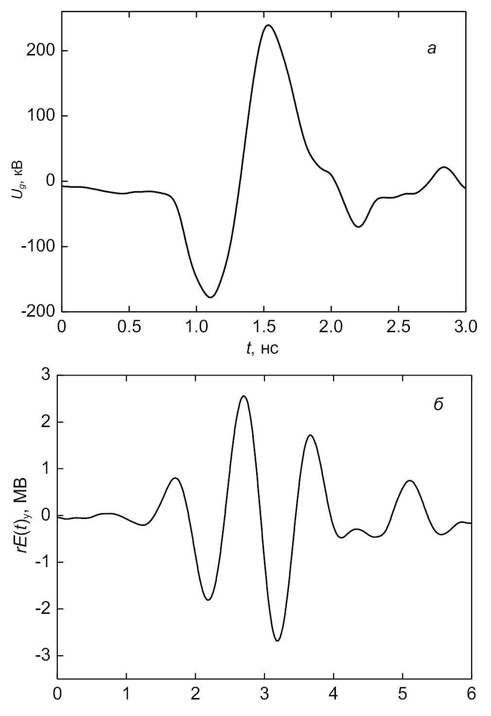 Рис. 9. Импульсы напряжения на входе антенной решетки (а) и напряженности вертикальной компоненты электрического поля на расстоянии r = 10.36 м (б).