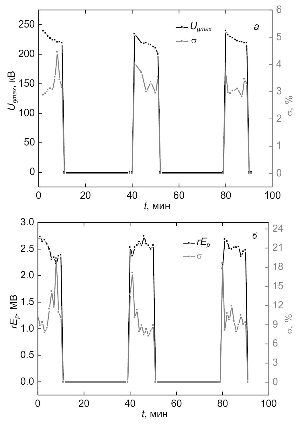 Для проверки стабильности излучения были выполнены следующие эксперименты. Источник излучения работал на частоте 100 Гц в течение 10 минут, затем был перерыв продолжительностью 30 минут для охлаждения генератора биполярных импульсов напряжения. Затем генератор снова включался на 10 минут. Были выполнены три серии измерений. Одновременно регистрировались амплитуда импульса напряжения Ugmax и ее среднеквадратичное отклонение σ , а также амплитудное значение вертикальной компоненты электрического поля, которое близко к Ep на годографе (рис. 10), и ее среднеквадратичное отклонение σ. Величина Ep умножалась на расстояние r = 10.36 м.
