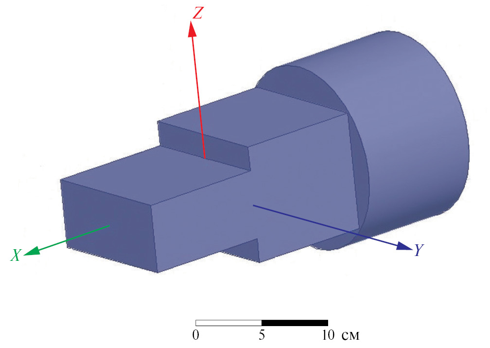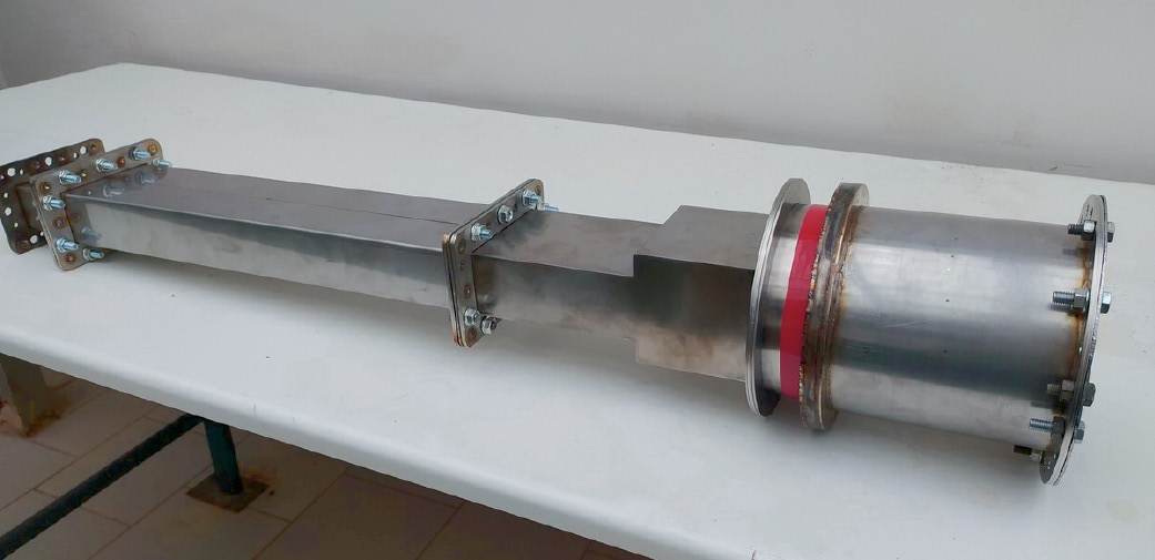 Выход СВЧ-генератора представляет собой одномодовый (Н10) прямоугольный волновод сечением 110 × 55 мм2. Диаметр патрубка крепления вакуумного окна составляет 155 мм, в нем может распространяться 5 мод электромагнитных колебаний на частоте 2.45 ГГц. Между ними был размещен согласующий трансформатор/преобразователь в виде отрезка прямоугольного волновода с увеличенным размером по узкой стенке (рис. 1).