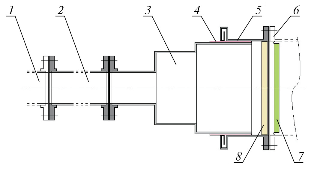 Выход СВЧ-генератора 1 (см. рис. 5) через дистанцирующий волновод 2 подключен к преобразователю мод 3. Выходная часть преобразователя 3 имеет форму цилиндра, на поверхности которого размещен изолирующий слой диэлектрика 4 (фторопласт), обеспечивающий гальваническую развязку с патрубком 5, на входном торце которого имеется дроссельное сочленение, препятствующее излучению СВЧ-энергии во внешнюю среду. Патрубок 5 крепится фланцевым соединением к диагностическому входу разрядной камеры 6. Для согласования неоднородности тракта, возникающей из-за вакуумного окна 7, в патрубке 5 размещен диэлектрический трансформатор 8.
