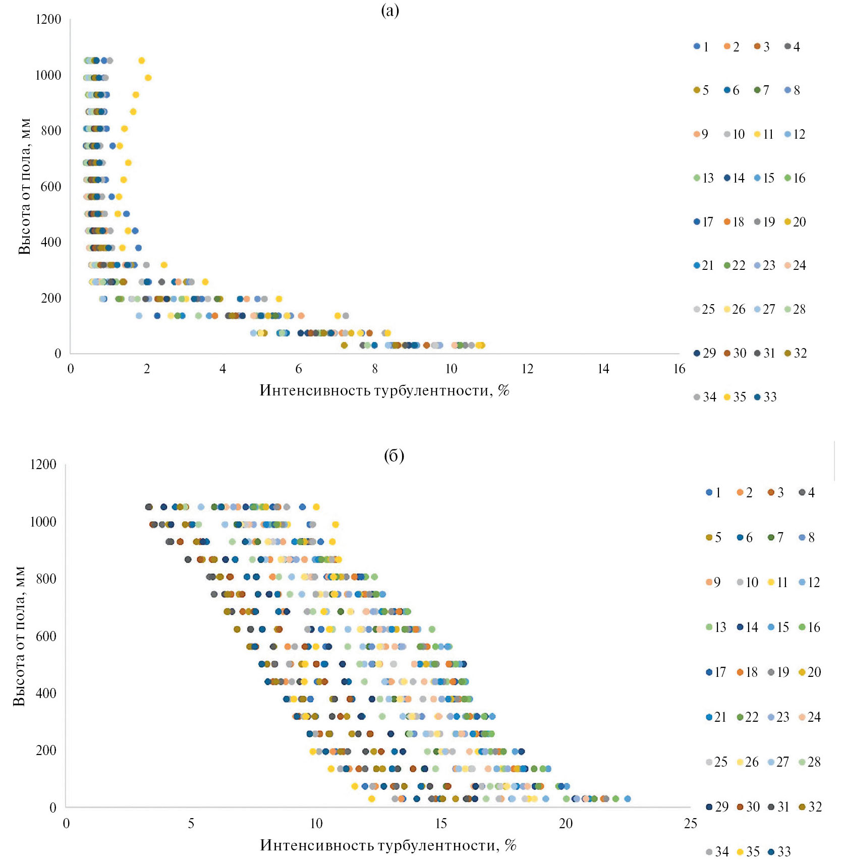 Рис. 3. Зависимость коэффициента турбулентности в зависимости от высоты: для пустой трубы (а) и для трубы с аэродинамическими сопротивлениями и турбулизаторами (б).