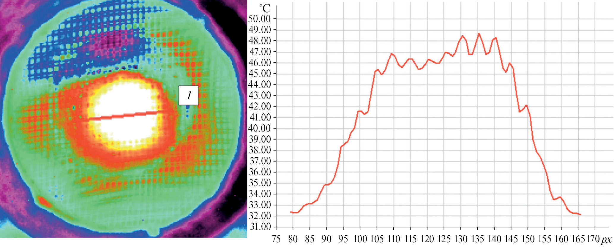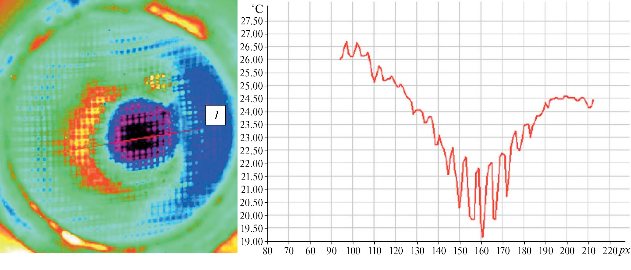 Рис. 8. Термограмма потока на выходе из диффузора в сечении и по длине контрольной линии на сетке (1 px = 0.1 мм) при D = 2.5 мм, β = 4 , P = 0.45 МПа.