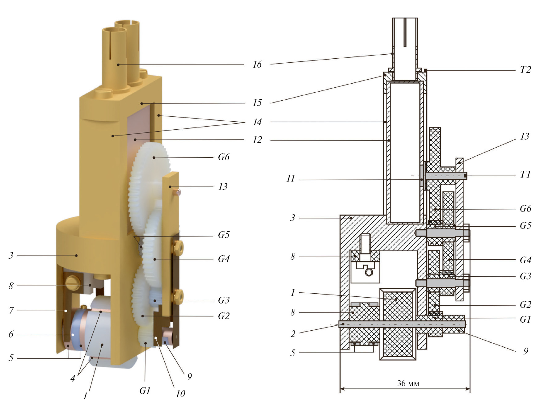 Рис. 1. Конструкция вращательного механизма на СВЧ резонаторе: слева – внешний вид, справа – разрез. Детали механизма: 1 – барабан, 2 – ось, 3 – корпус, 4 – обмотки, 5 – медные кольца, 6 – втулка, 7 – бронзовые лепестки, 8 – держатель лепестков; 9, 10 – втулка и скользящие контакты датчика поворота, 11 – ось с монтажной площадкой для образца, 12 – резонатор, 13 – прижимная планка, 14 – крепежные стойки, 15 – верхний фланец, 16 – цанги волноводов, G1–G6 – шестерни, Т1, T2 – термометры RuO2. Штрихпунктирные линии – поворотные оси механизма.