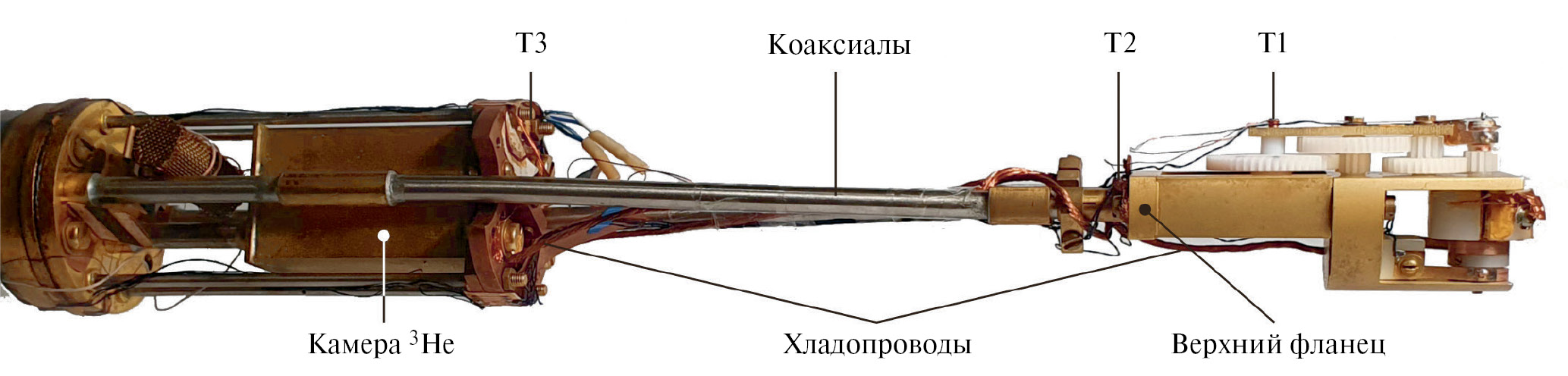 Рис. 2. Фотография устройства, смонтированного на СВЧ-спектрометр, совмещенный с криостатом откачки 3He; Т1, Т2 и Т3 – термометры.