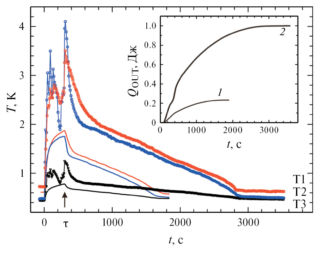 Рис. 3. Зависимость температуры датчиков Т1, Т2 и Т3 от времени в процессе пропускания тока в течение 5 минут через одну из обмоток в нулевом поле (сплошные линии) и при переключении тока между обмотками в поле 6 Тл с вращением образца на 60° (символы) с последующим охлаждением. Стрелкой показан момент выключения тока τ = 300c. На вставке показано количество тепла, отведенного от ячейки в криостат через медные кабели при обоих процессах (линии 1 и 2 соответственно).